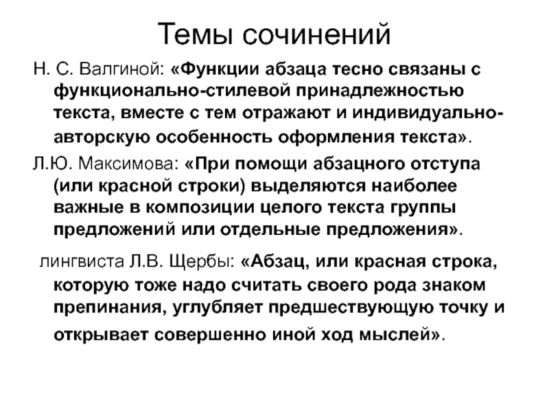 Л.Ю. Максимова: «При помощи абзацного отступа (или красной строки) выделяются наиболее важные в композиции целого текста группы предложений или отдельные предложения».