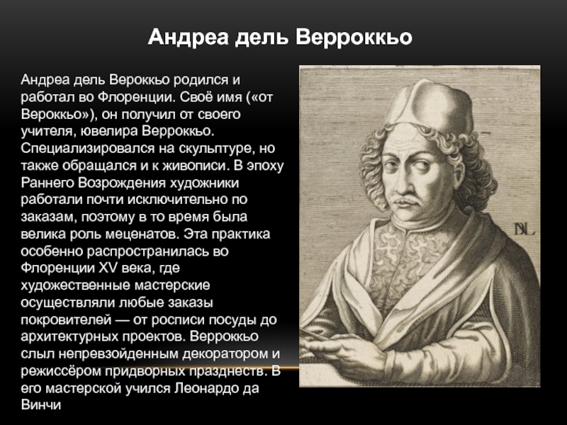 на скульптуре, но также обращался и к живописи. В эпоху Раннего Возрождения художники работали почти исключительно по заказам, поэтому в то время была велика роль меценатов. Эта практика особенно распространилась во Флоренции XV века, где художественные мастерские осуществляли любые заказы покровителей — от росписи посуды до архитектурных проектов. Верроккьо слыл непревзойденным декоратором и режиссёром придворных празднеств. В его мастерской учился Леонардо да Винчи