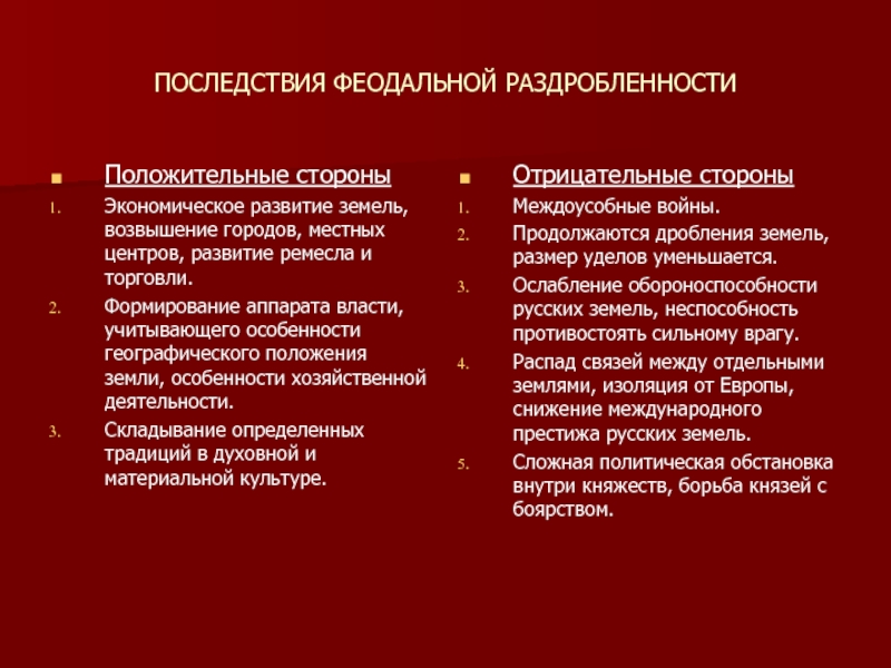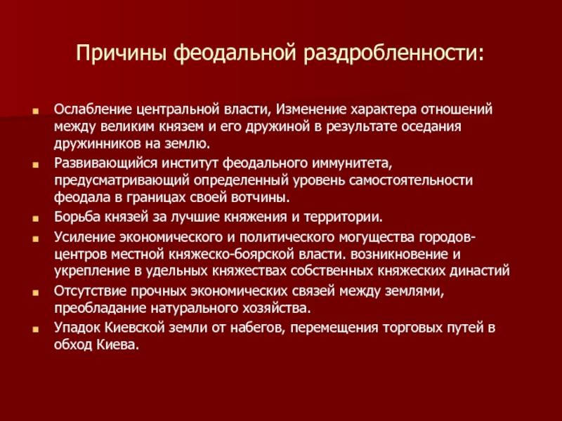 институт феодального иммунитета, предусматривающий определенный уровень самостоятельности феодала в границах своей вотчины.Борьба князей за лучшие княжения и территории.