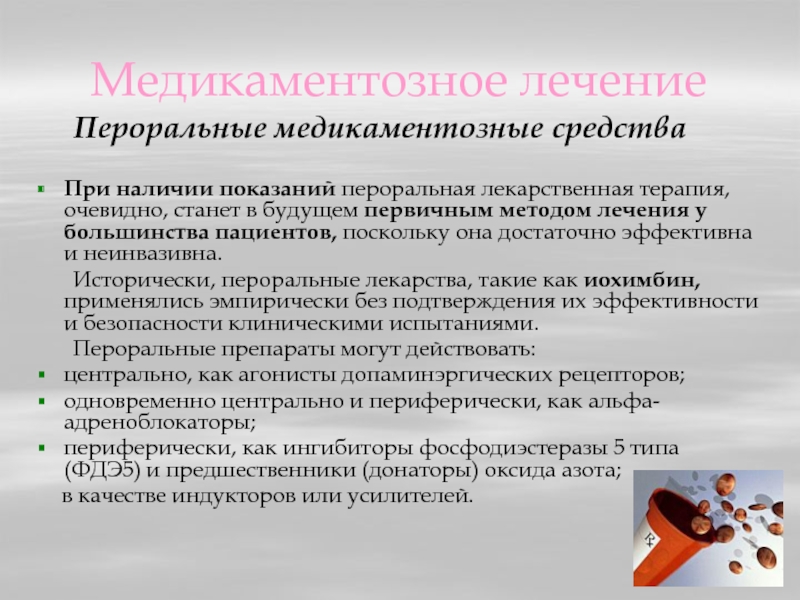 Исторически, пероральные лекарства, такие как иохимбин, применялись эмпирически без подтверждения их эффективности и безопасности клиническими испытаниями.