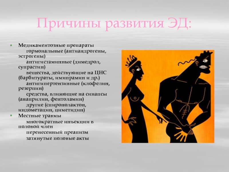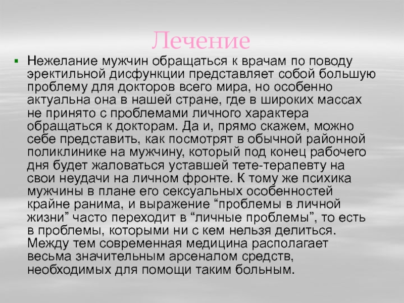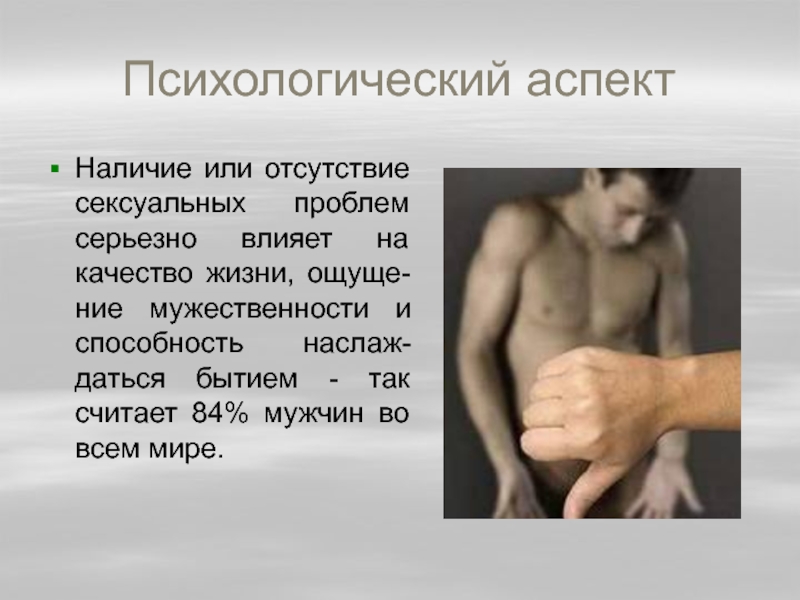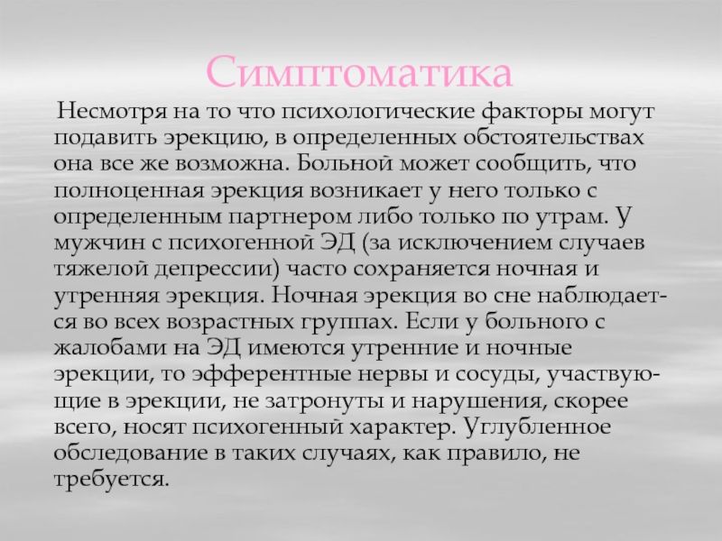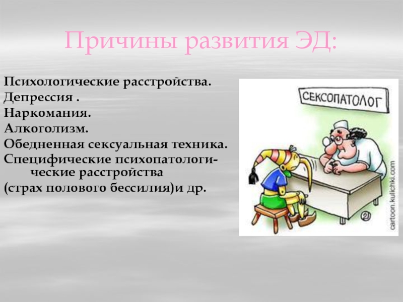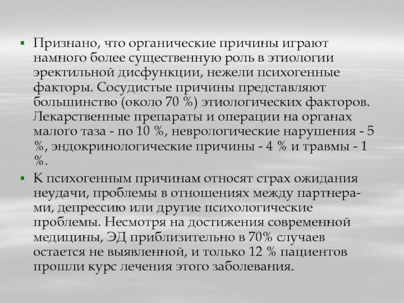 К психогенным причинам относят страх ожидания неудачи, проблемы в отношениях между партнера-ми, депрессию или другие психологические проблемы. Несмотря на достижения современной медицины, ЭД приблизительно в 70% случаев остается не выявленной, и только 12 % пациентов прошли курс лечения этого заболевания.