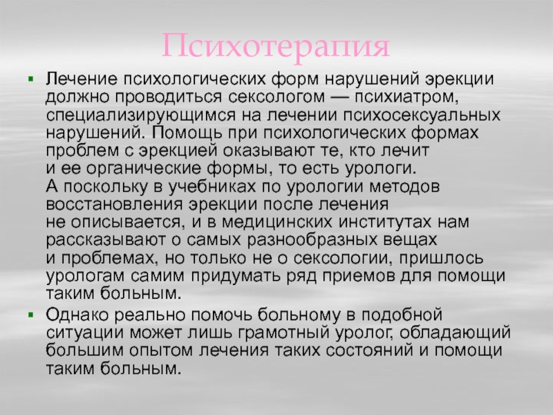 Лечение психологических форм нарушений эрекции должно проводиться сексологом — психиатром, специализирующимся