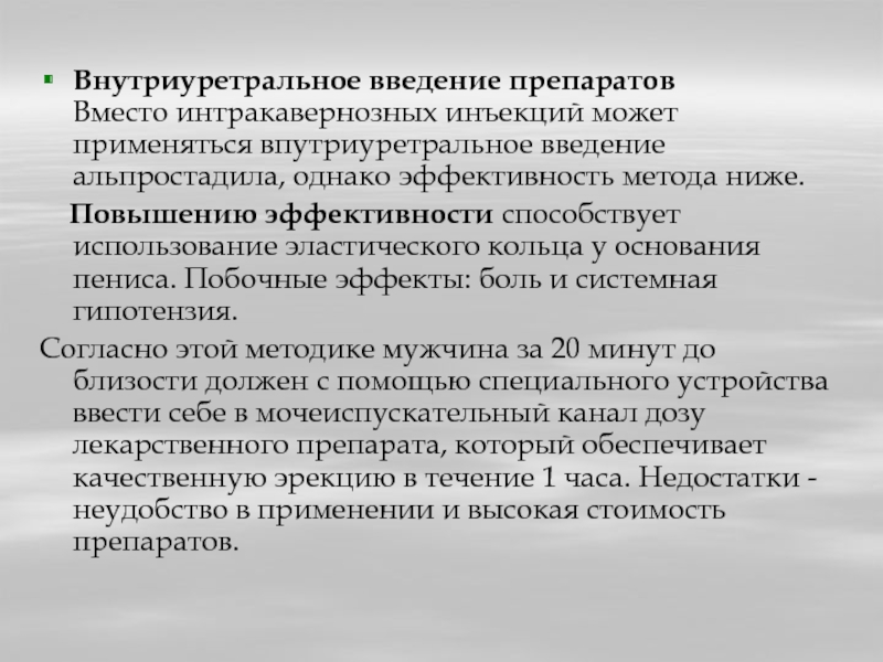Вместо интракавернозных инъекций может применяться впутриуретральное введение альпростадила,