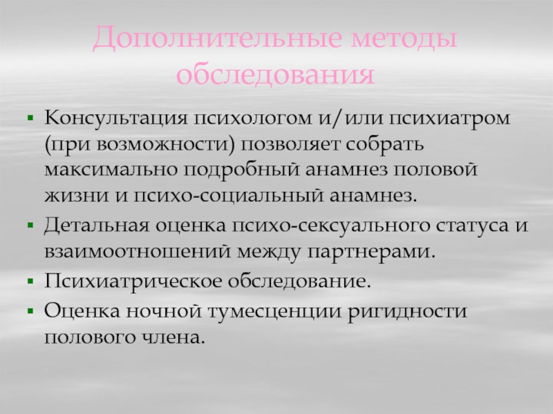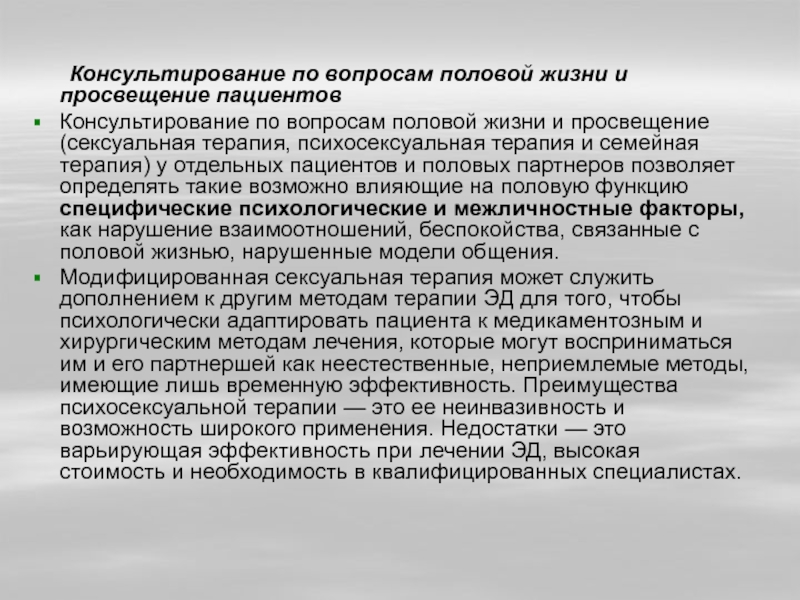 терапия и семейная терапия) у отдельных пациентов и половых партнеров позволяет определять такие возможно влияющие на половую функцию специфические психологические и межличностные факторы, как нарушение взаимоотношений, беспокойства, связанные с половой жизнью, нарушенные модели общения.