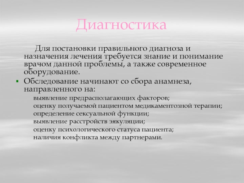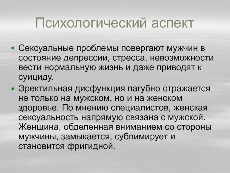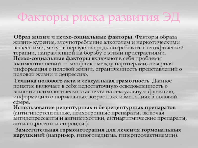 могут в первую очередь потребовать специфической терапии, направленной на борьбу с этими пристрастиями. Психо-социальные факторы включают в себя проблемы взаимоотношений — конфликт между партнерами, неверная информация о половой жизни, ограниченность представлений о половой жизни и депрессию.