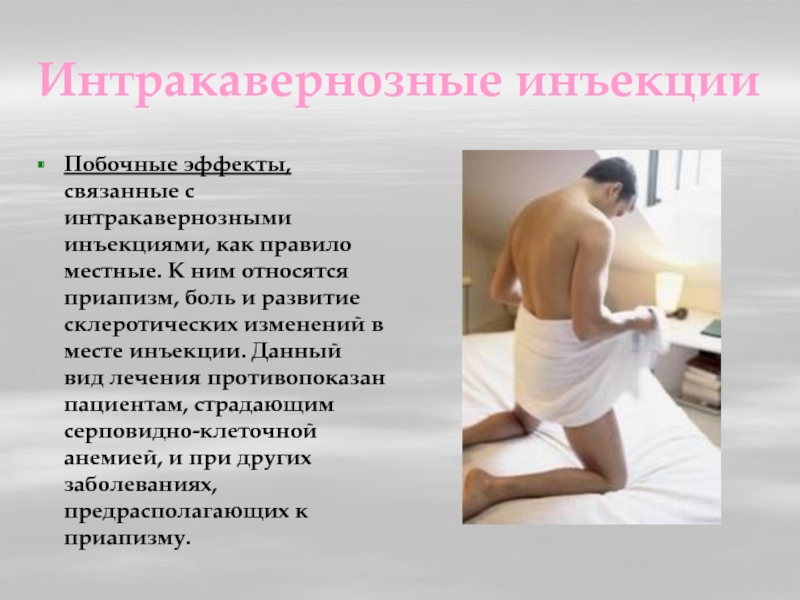 месте инъекции. Данный вид лечения противопоказан пациентам, страдающим серповидно-клеточной анемией, и при других заболеваниях, предрасполагающих к приапизму.