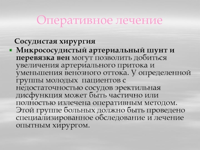 У определенной группы молодых пациентов с недостаточностью сосудов эректильная дисфункция может быть частично или полностью излечена оперативным методом. Этой группе больных должно быть проведено специализированное обследование и лечение опытным хирургом.