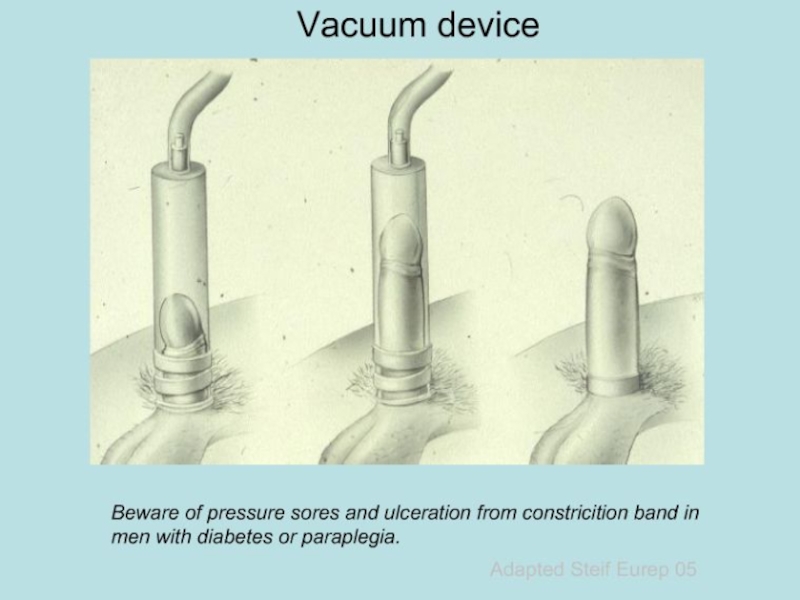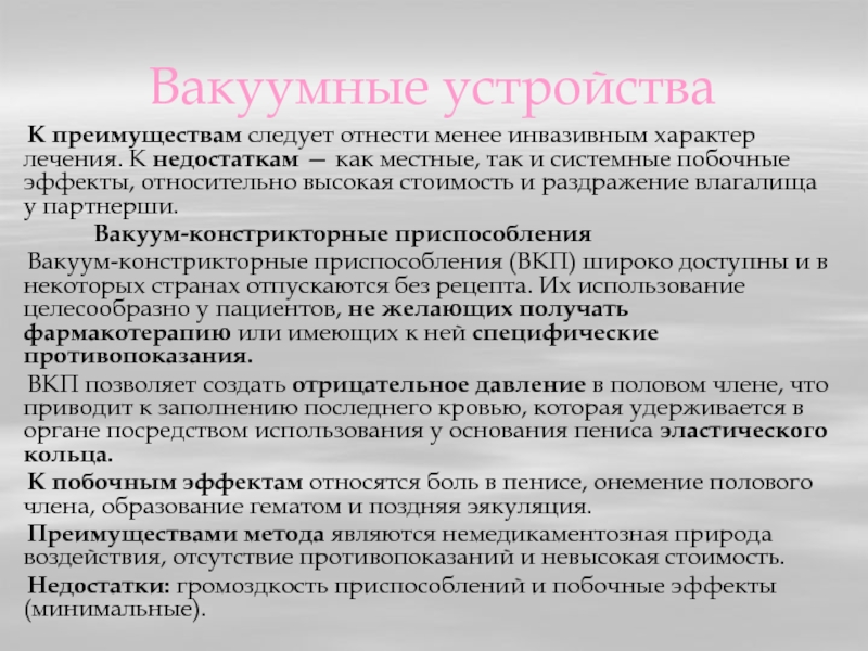 Вакуум-констрикторные приспособления (ВКП) широко доступны и в некоторых странах отпускаются без рецепта. Их использование целесообразно у пациентов, не желающих получать фармакотерапию или имеющих к ней специфические противопоказания.