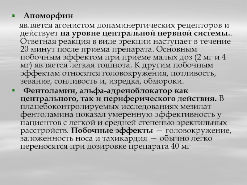 Фентоламин, альфа-адреноблокатор как центрального, так и периферического действия. В плацебоконтролируемых исследованиях мезилат фентоламина показал умеренную эффективность у пациентов с легкой и средней степенью эректильных расстройств. Побочные эффекты — головокружение, заложенность носа и тахикардия — обычно легко переносятся при дозировке препарата 40 мг
