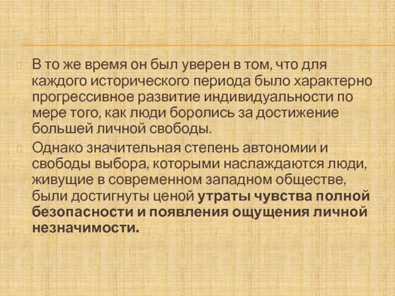 Однако значительная степень автономии и свободы выбора, которыми наслаждаются люди, живущие в современном западном обществе, были достигнуты ценой утраты чувства полной безопасности и появления ощущения личной незначимости.
