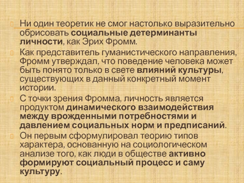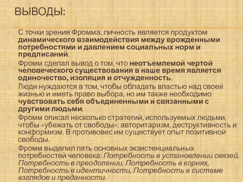 С точки зрения Фромма, личность является продуктом динамического взаимодействия между врожденными потребностями и давлением социальных норм и предписаний.