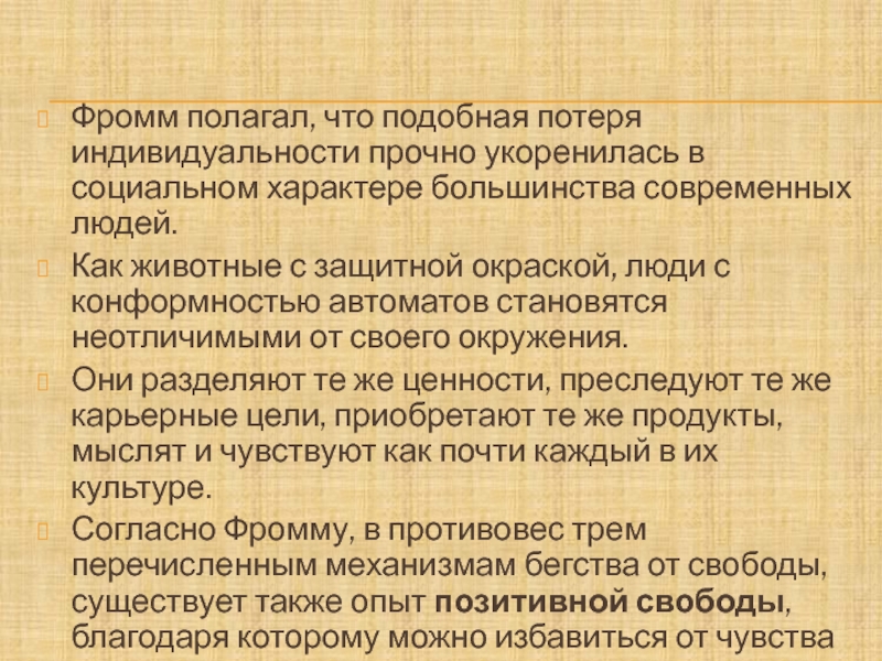 Слайд 15Фромм полагал, что подобная потеря индивидуальности прочно укоренилась в социальном