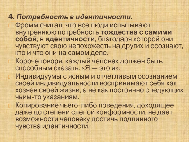 Копирование чьего-либо поведения, доходящее даже до степени слепой конформности, не дает возможности человеку достичь подлинного чувства идентичности.