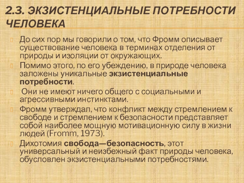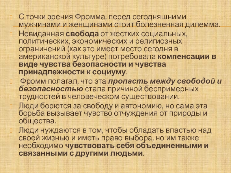 Фромм полагал, что эта пропасть между свободой и безопасностью стала причиной беспримерных трудностей в человеческом существовании.