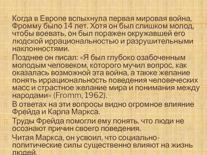 Слайд 6Когда в Европе вспыхнула первая мировая война, Фромму было 14