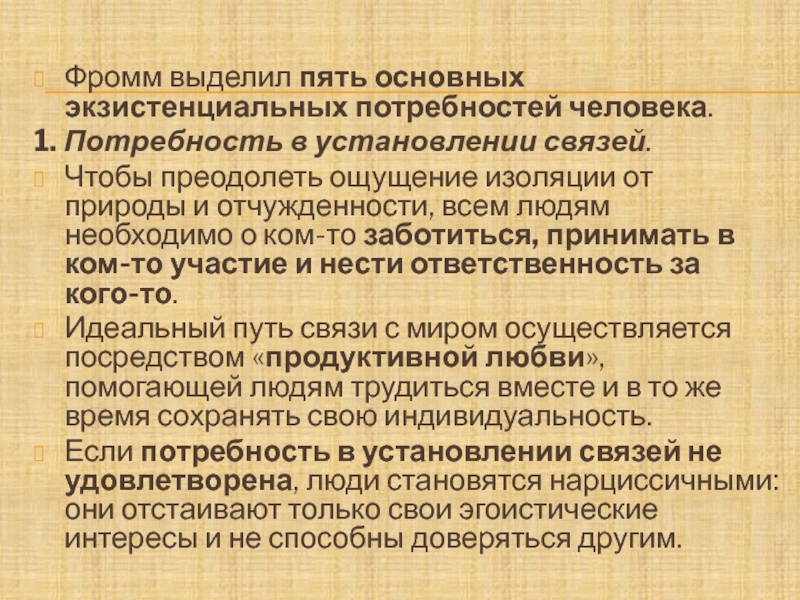 Фромм выделил пять основных экзистенциальных потребностей человека: Потребность в установлении связей, Потребность в преодолении, Потребность в корнях, Потребность в идентичности, Потребность в системе взглядов и преданности.