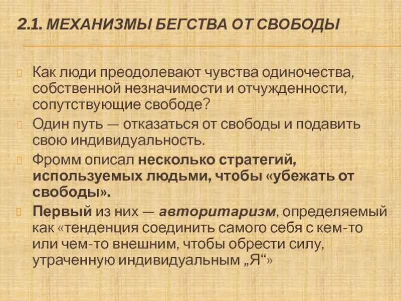 Первый из них — авторитаризм, определяемый как «тенденция соединить самого себя с кем-то или чем-то внешним, чтобы обрести силу, утраченную индивидуальным „Я“»