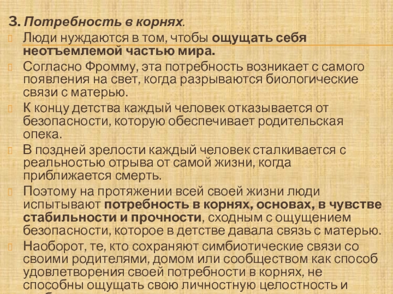 Наоборот, те, кто сохраняют симбиотические связи со своими родителями, домом или сообществом как способ удовлетворения своей потребности в корнях, не способны ощущать свою личностную целостность и свободу.