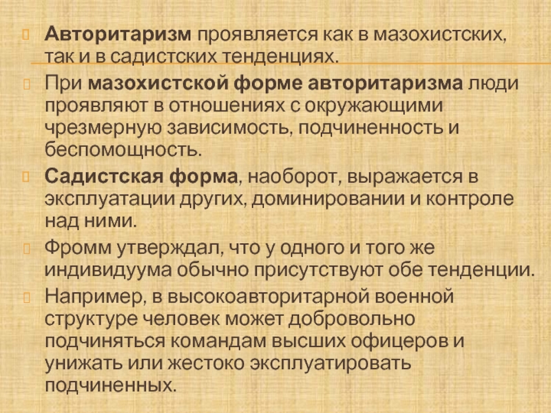 Слайд 13Авторитаризм проявляется как в мазохистских, так и в садистских тенденциях.