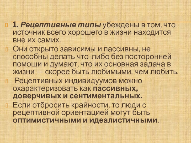 Слайд 261. Рецептивные типы убеждены в том, что источник всего хорошего