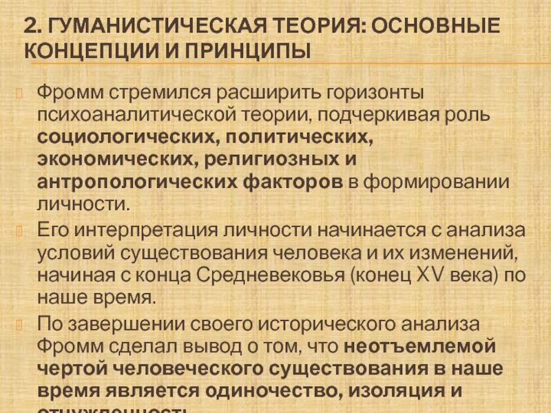 По завершении своего исторического анализа Фромм сделал вывод о том, что неотъемлемой чертой человеческого существования в наше время является одиночество, изоляция и отчужденность.
