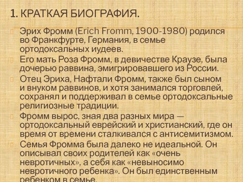 Семья Фромма была далеко не идеальной. Он описывал своих родителей как «очень невротичных», а себя как «невыносимо невротичного ребенка». Он был единственным ребенком в семье.