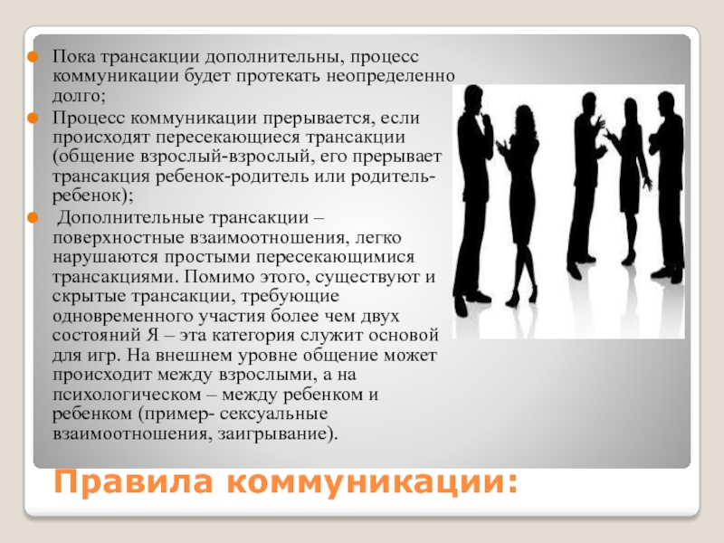 коммуникации прерывается, если происходят пересекающиеся трансакции (общение взрослый-взрослый, его прерывает