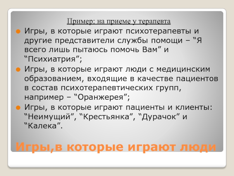 Игры, в которые играют пациенты и клиенты: “Неимущий”, “Крестьянка”, “Дурачок” и “Калека”.