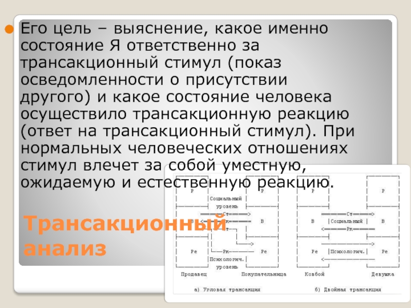 состояние человека осуществило трансакционную реакцию (ответ на трансакционный стимул). При нормальных человеческих отношениях стимул влечет за собой уместную, ожидаемую и естественную реакцию.