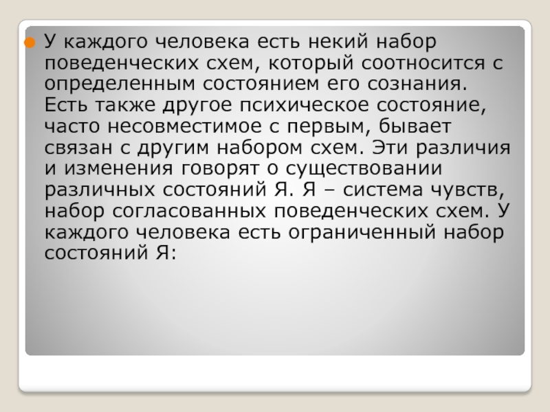часто несовместимое с первым, бывает связан с другим набором схем. Эти различия и изменения говорят о существовании различных состояний Я. Я – система чувств, набор согласованных поведенческих схем. У каждого человека есть ограниченный набор состояний Я: