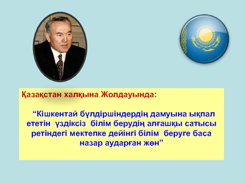 Қазақстан халқына Жолдауында:  “Кішкентай бүлдіршіндердің дамуына ықпал ететін үздіксіз білім берудің алғашқы сатысы  ретіндегі мектепке