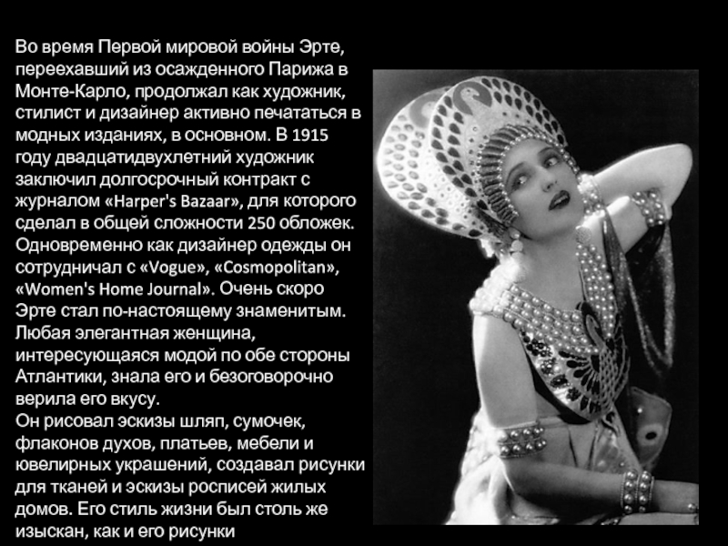 в модных изданиях, в основном. В 1915 году двадцатидвухлетний художник заключил долгосрочный контракт с журналом «Harper's Bazaar», для которого сделал в общей сложности 250 обложек. Одновременно как дизайнер одежды он сотрудничал с «Vogue», «Cosmopolitan», «Women's Home Journal». Очень скоро Эрте стал по-настоящему знаменитым. Любая элегантная женщина, интересующаяся модой по обе стороны Атлантики, знала его и безоговорочно верила его вкусу.