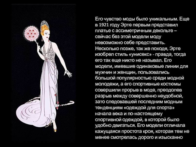 Слайд 13Его чувство моды было уникальным. Еще в 1921 году Эрте