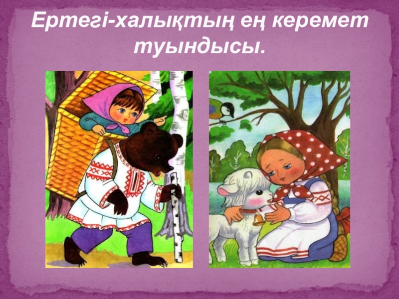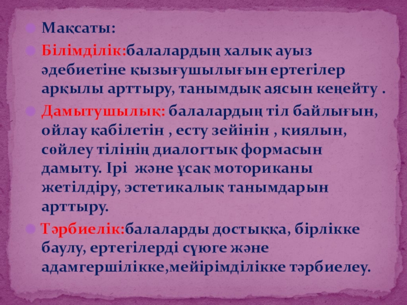 қиялын, сөйлеу тілінің диалогтық формасын дамыту. Ірі және ұсақ моториканы жетілдіру, эстетикалық танымдарын арттыру.Тәрбиелік:балаларды достыққа, бірлікке баулу, ертегілерді сүюге және адамгершілікке,мейірімділікке тәрбиелеу.