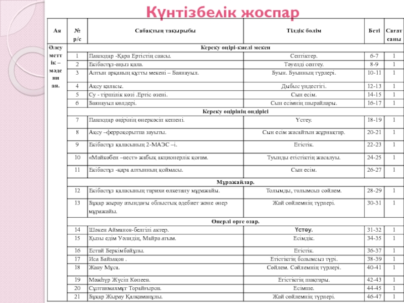 Оқу құралы 34 сағатқа негізделіп құрастырылған. Дидактикалық материалдар жинағы Павлодар өңірінің әдебиетін,мәдениетін оқып білуге негізделген.