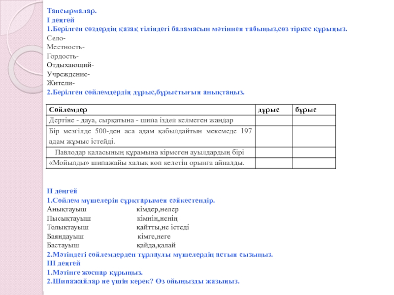 1.Берілген сөздердің қазақ тіліндегі баламасын мәтіннен табыңыз,сөз тіркес құрыңыз.