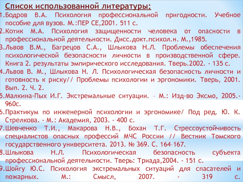 Шлыкова Н.Л. Психологическая безопасность субъекта профессиональной деятельности. Тверь: Триада,2004. - 151 с.
