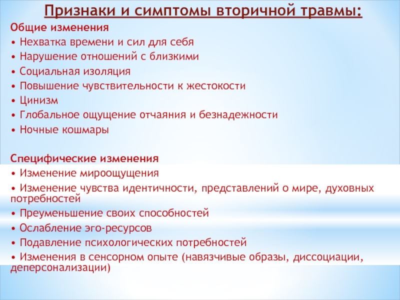 Слайд 10Признаки и симптомы вторичной травмы: