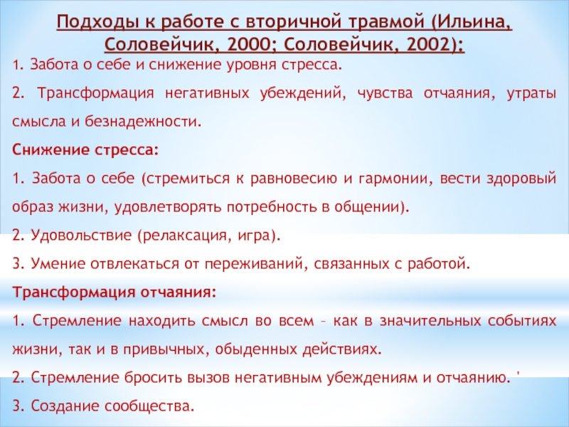 Слайд 12Подходы к работе с вторичной травмой (Ильина, Соловейчик, 2000; Соловейчик,