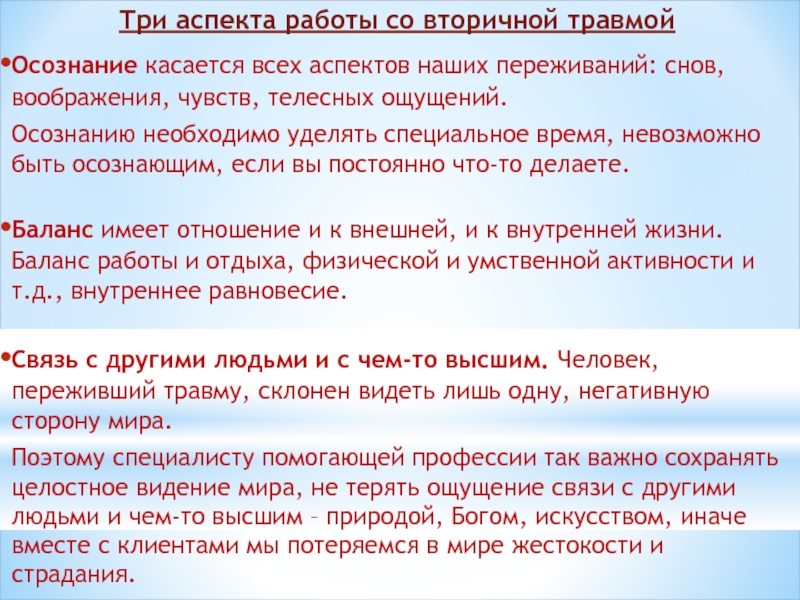 Слайд 13Три аспекта работы со вторичной травмой