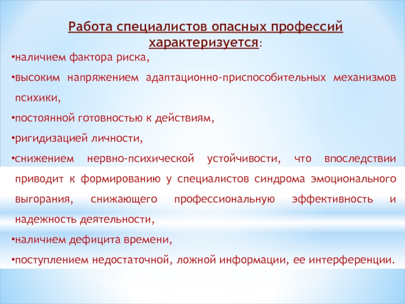 Слайд 4Работа специалистов опасных профессий характеризуется: