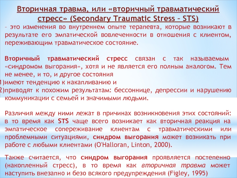 Также считается, что синдром выгорания проявляется постепенно (накопленный стресс), в то время как вторичная травма может наступить внезапно и безо всякого предупреждения (Figley, 1995)