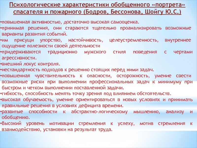 Слайд 6Психологические характеристики обобщенного «портрета» спасателя и пожарного (Бодров, Бессонова, Шойгу