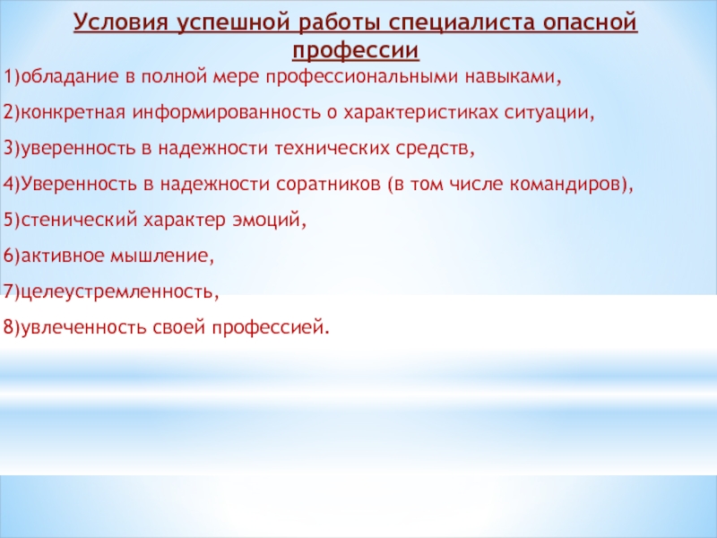 Слайд 5Условия успешной работы специалиста опасной профессии