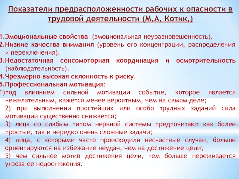 Слайд 3Показатели предрасположенности рабочих к опасности в трудовой деятельности (М.А. Котик.)