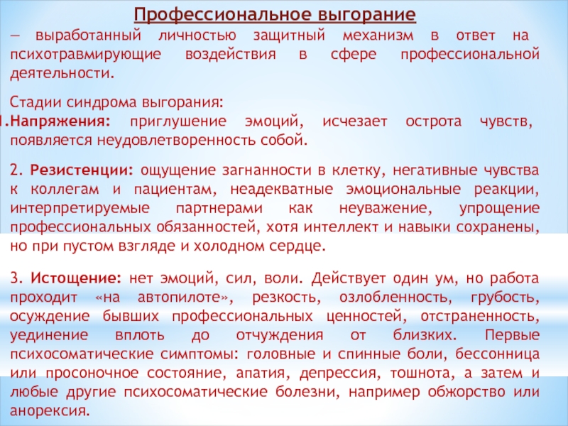2. Резистенции: ощущение загнанности в клетку, негативные чувства к коллегам и пациентам, неадекватные эмоциональные реакции, интерпретируемые партнерами как неуважение, упрощение профессиональных обязанностей, хотя интеллект и навыки сохранены, но при пустом взгляде и холодном сердце.