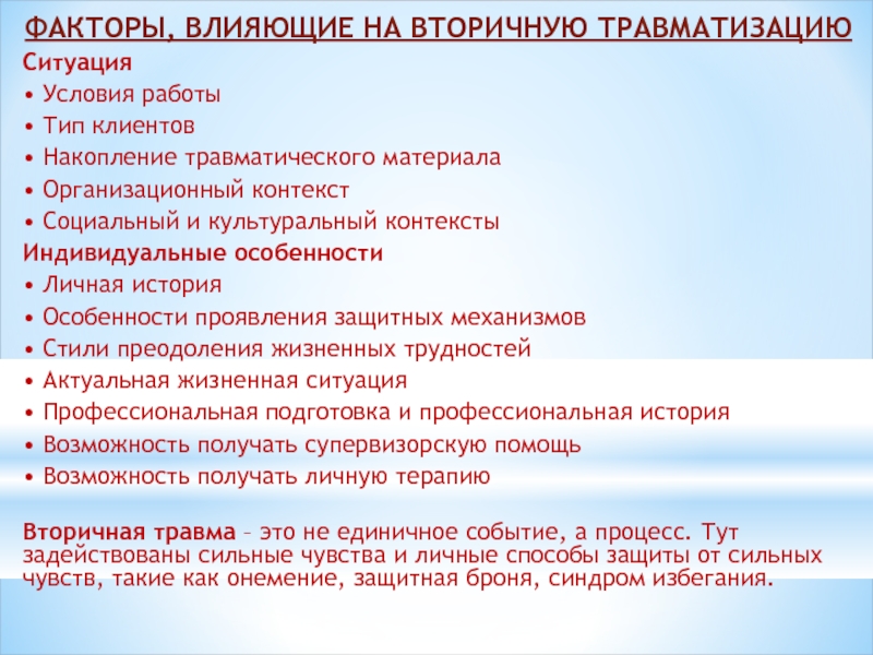 Слайд 11ФАКТОРЫ, ВЛИЯЮЩИЕ НА ВТОРИЧНУЮ ТРАВМАТИЗАЦИЮ