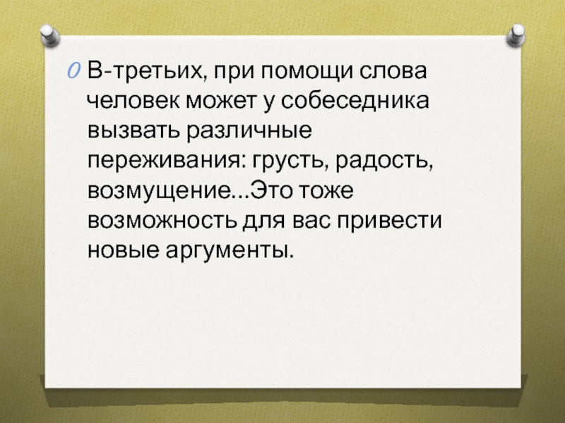 Слайд 5В-третьих, при помощи слова человек может у собеседника вызвать различные