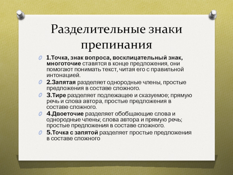4.Двоеточие разделяет обобщающие слова и однородные члены; слова автора и прямую речь; простые предложения в составе сложного.