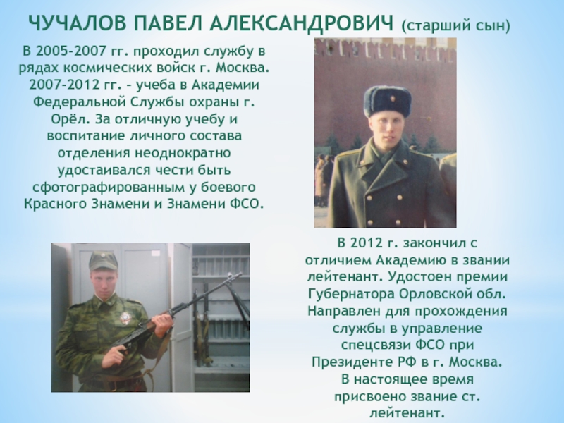 Направлен для прохождения службы в управление спецсвязи ФСО при Президенте РФ в г. Москва.